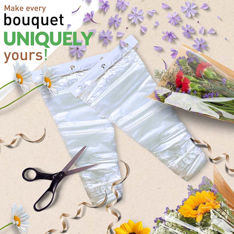 These sealed bottom sleeves keep the moisture contained and your flowers fresh. Sleeves are great for consumer custom selection or for pre-packed bouquets. These quality, clear tapered poly sleeves feature a sealed bottom, avoiding leakage (though heat sealed on the bottom, sleeves are not designed to be filled with water). Sleeves measure 13.5" diameter x 25" tall x 4" at the bottom. The bundle of sleeves is held together at the top with a tear-away feature. These work well for the cut flower wholesale and retail markets. Package contains 100 sleeves.