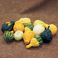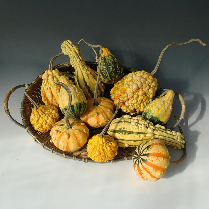 Fancy Warted Mix is an improved selection of warted gourds in various combinations of yellow, orange, ivory, and green shades. This eye-catching mix produces warted fruit with color patterns that are solid, striped and bicolored. Fancy Warted Mix contains fruit shaped like pear, spoon, and round. A colorful and interesting mix that enhance fall displays.