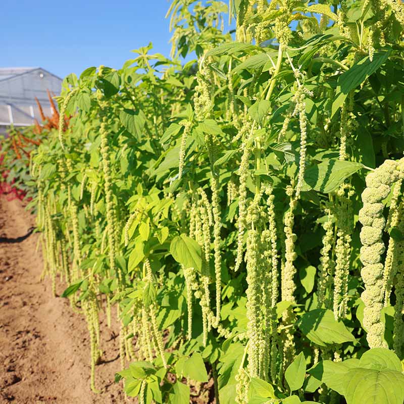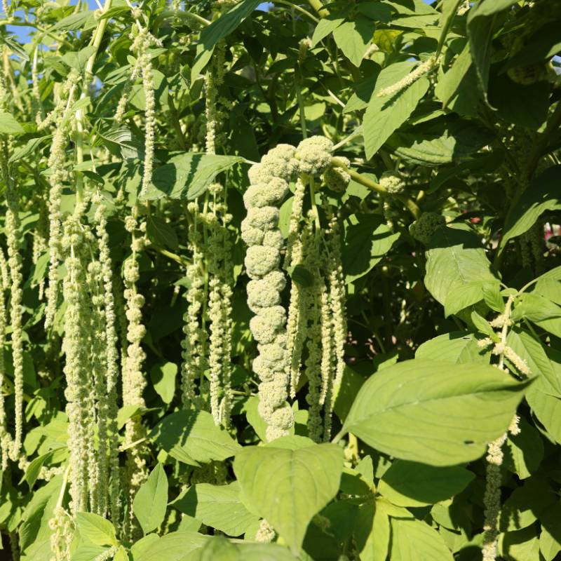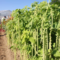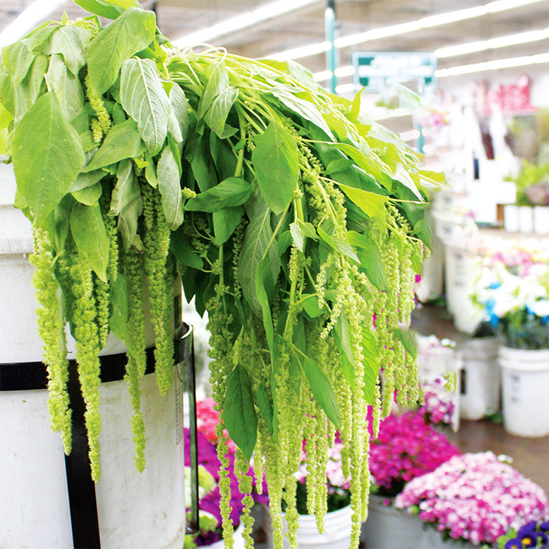 This is the phytocentric version of Love-Lies-Bleeding, all emerald with elegant spilling tassels. Height: 30-60”.