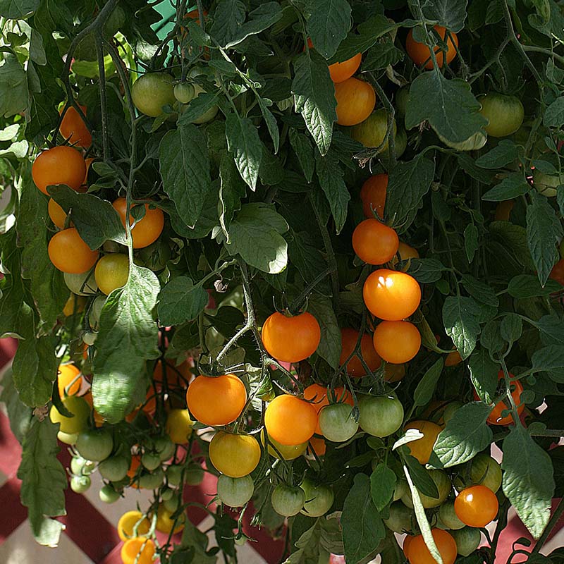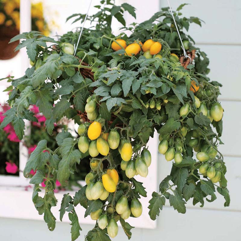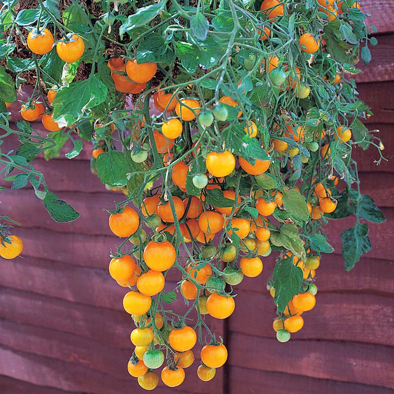 With their mild flavor and brilliant looks, golden Tumbling Tom Tomatoes are perfect for your hanging basket. As they grow, Tumbling Tom tomatoes cascade over the top of the basket in a cheery yellow display. Tumbling Toms are ideal fruit plants for patios, decks, porches and smaller spaces.