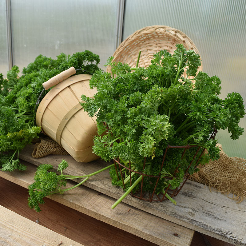 Biennial. A vigorous, dark green semi-curled type that tolerates heat and repetitive cuttings well. The long, stiff stems and thick leaves make it easy to cut and bunch.
