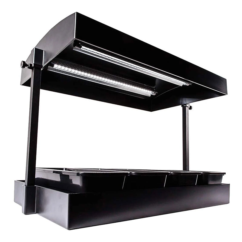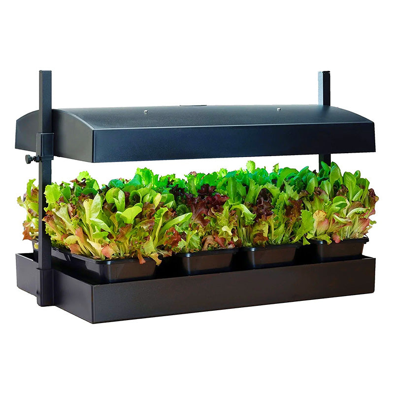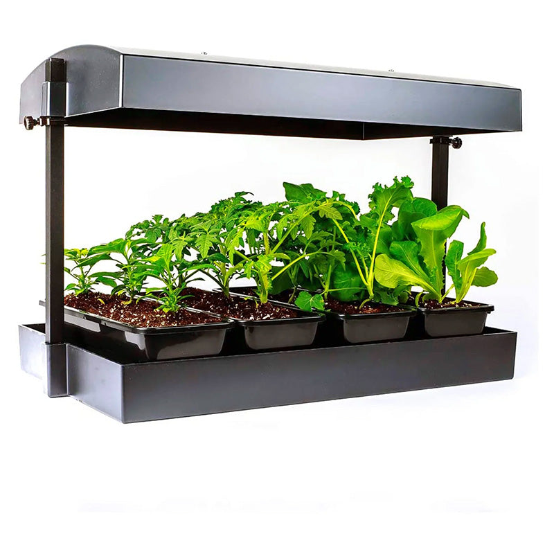 Great for seed starting or indoor gardening all year long. The Grow Light Garden comes with two 18W LED fixtures that provide plants with 6400K wide spectrum lighting. The lights are housed in the canopy that directs light down to the plants to optimize lighting efficiency. The light height is fully adjustable allowing a maximum clearance height of 14 inches from the bottom of the base tray. The Grow Light Garden also features 4 growing trays, a self-watering capillary mat, and water reservoir. Stand measures 17"H x 24"W x 14"D.