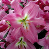 Pink upward facing flowers have small white centers and prominent veins. Resistant to leaf scorch. 16/18 cm bulbs, averaging 3-5 flowers per stem, 40” natural height, 13 weeks to force.