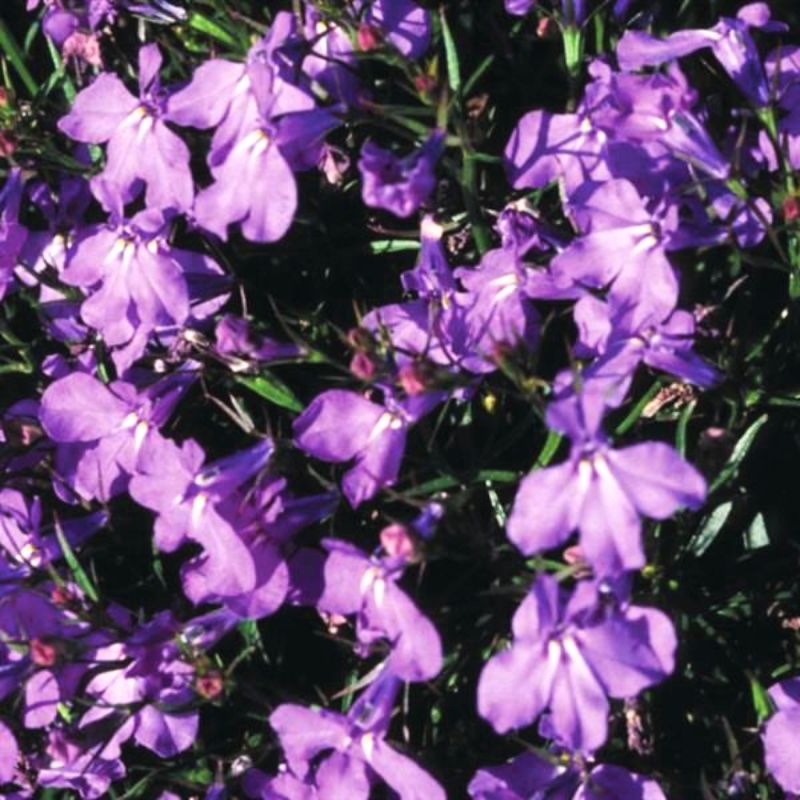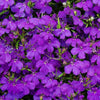 Dark blue flowers on compact bronze-foliaged plants, commonly known as Cardinal Flower.