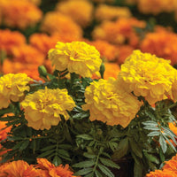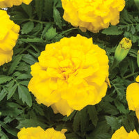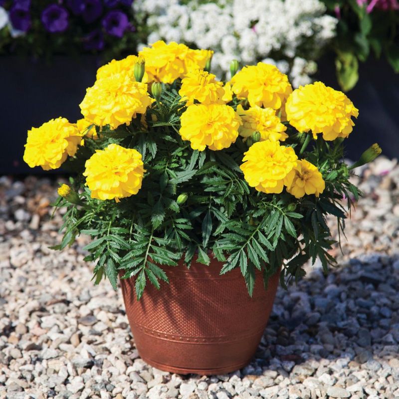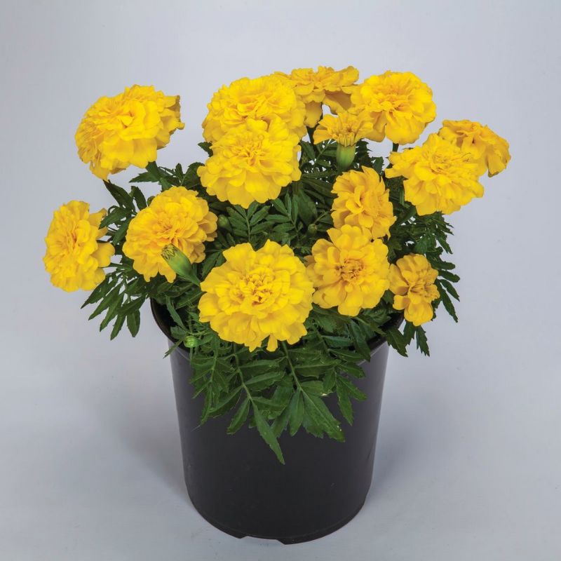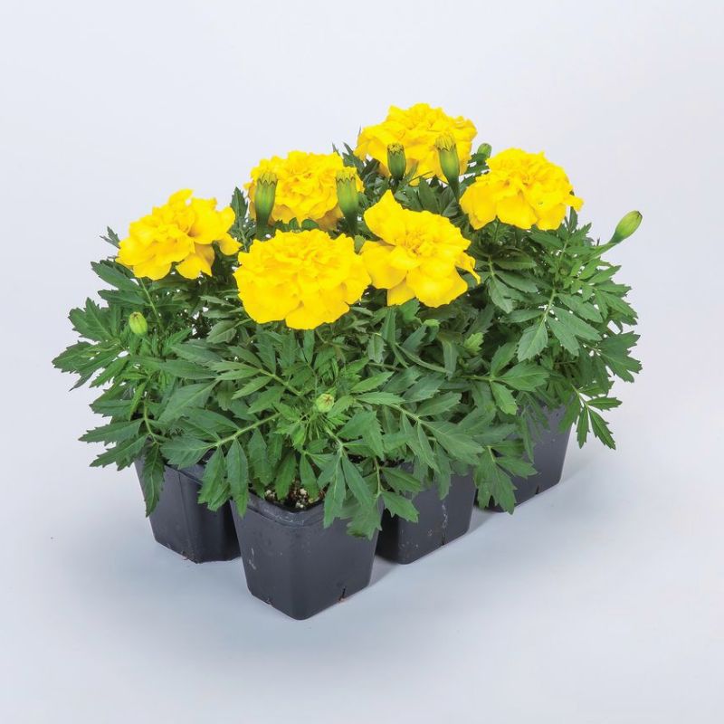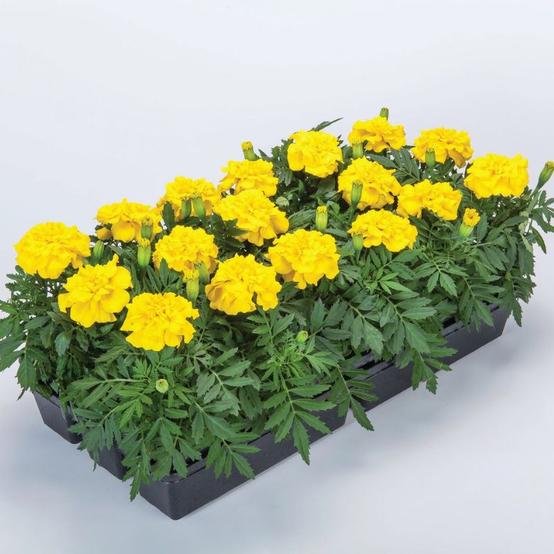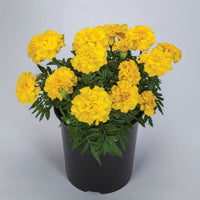 The perfect cross for early blooms up through frost! Quick to bloom highly compact plants that you expect from French marigolds with the large double carnation flowers resembling African types. Sell in standard and premium packs, 4” pots, and mixed containers.