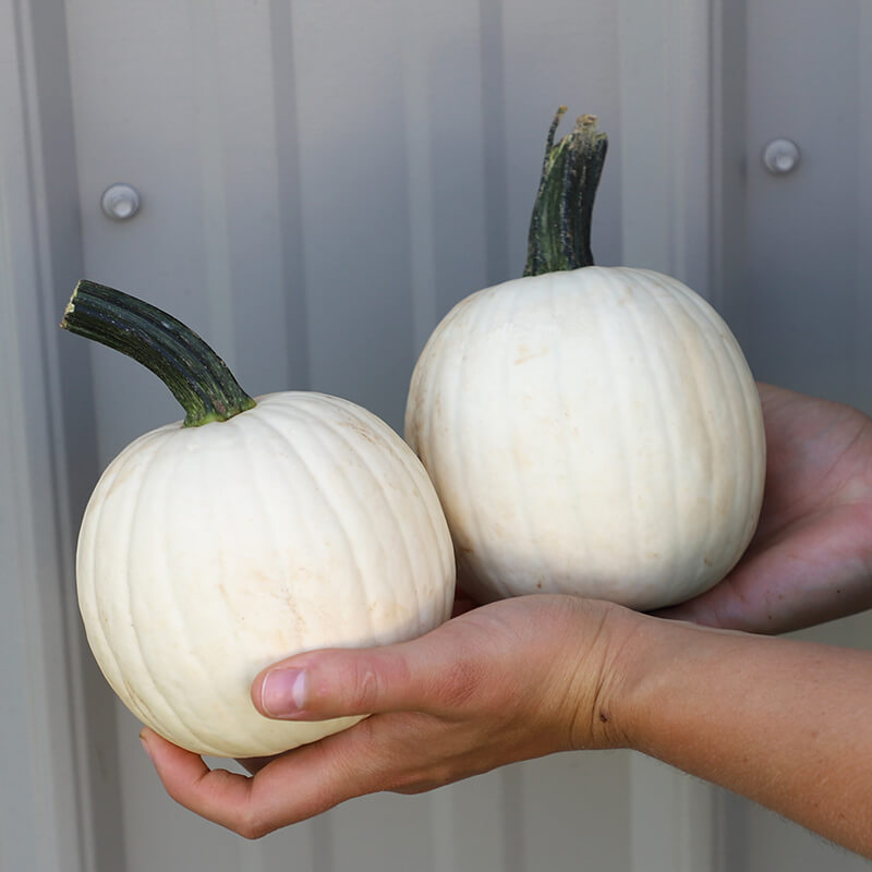 Previously named "Pumpkin Marshmallow". Miniature round to upright white pumpkins are set on medium vines in numbers as high as 15-20 fruit per plant. Strong dark green stems contrast the bright white color that stays white through the season. Pair Marshmallow with novel varieties like Hot Chocolate for warm fall color palettes.