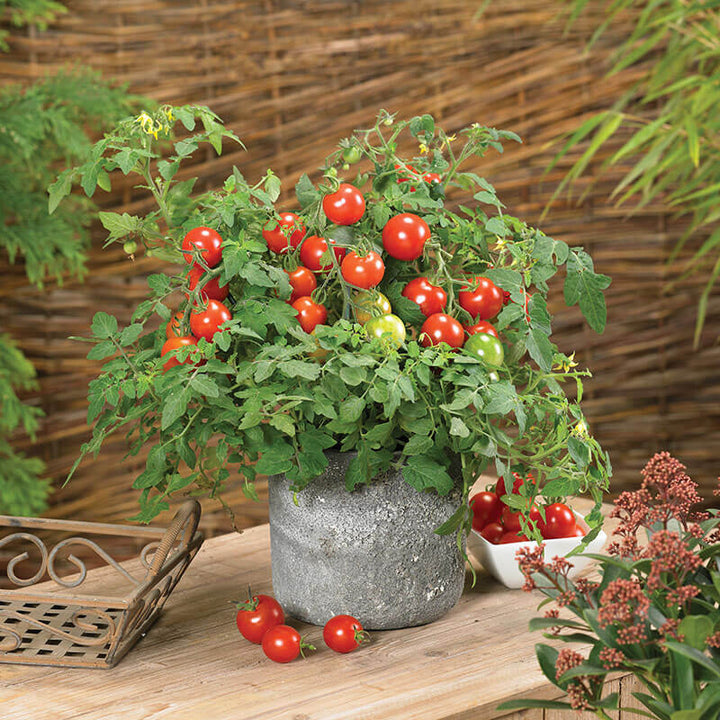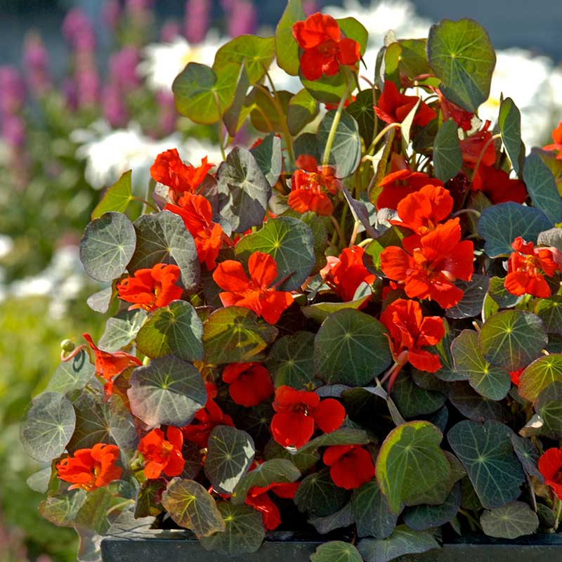 Brilliant scarlet flowers contrast exceptionally well with the dark foliage of this compact nasturtium. Ideal for adding color to mixed planters.
