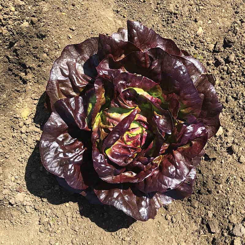 A compact variety with smooth leaves showcasing deep burgundy color and fresh bright green well-filled interiors. Sweet tender leaves and short cores made Marciano a trial favorite. High resistance to Downy Mildew, Lettuce Leaf Aphid, and Tomato Bushy Stunt Virus, and intermediate resistance to Lettuce Mosaic Virus.