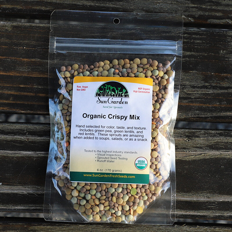 Great in soups, Crispy Salad Mix includes Green Pea, Green Lentils, and Red Lentils. They are great sprinkled over a salad, and can be mixed into soups and other dishes to add flavor and crunch. Crunchy Sprouts contain amino acids and are high in Vitamins A, C, E, iron, calcium, phosphorous and potassium. Approximately 2 TBS. of seed per ounce. USDA Organic.