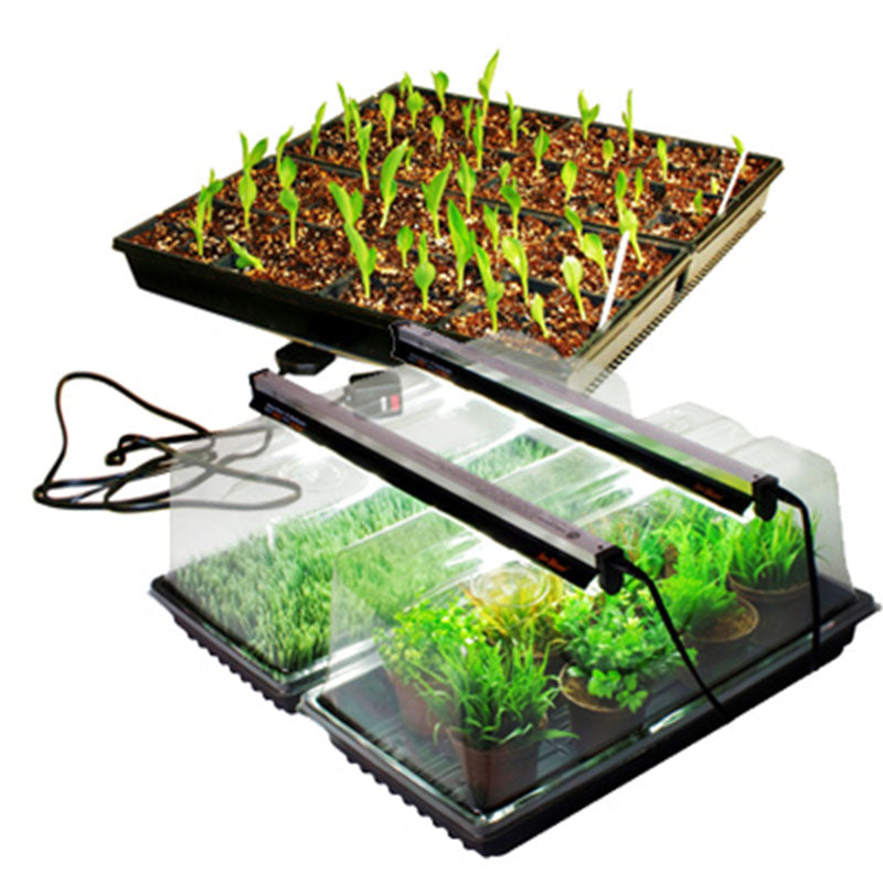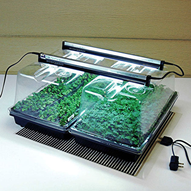Combine light and bottom heat for best germination! These money saving kits combine SunBlaster's Mini Greenhouse Kit with our top selling Kwik Grow Heat Mats. SunBlaster's Mini Greenhouse Kit Large Combo provides an excellent environment for starting your transplants, indoor herb gardens, micro greens and other indoor gardening. The kit includes two 18" full spectrum 6400K grow light and reflector, SunBlaster's exclusive NanoDome that has a unique H pattern which enables you to lay your lighting across a single dome or multiple domes, and two extra thick 10" x 20" no drainage planting tray with domes. Our Kwik Grow seed tray heaters are safe, low-voltage, and professional quality. They are designed to generate exceptionally uniform, gentle heat that is ideal for germinating seeds.