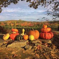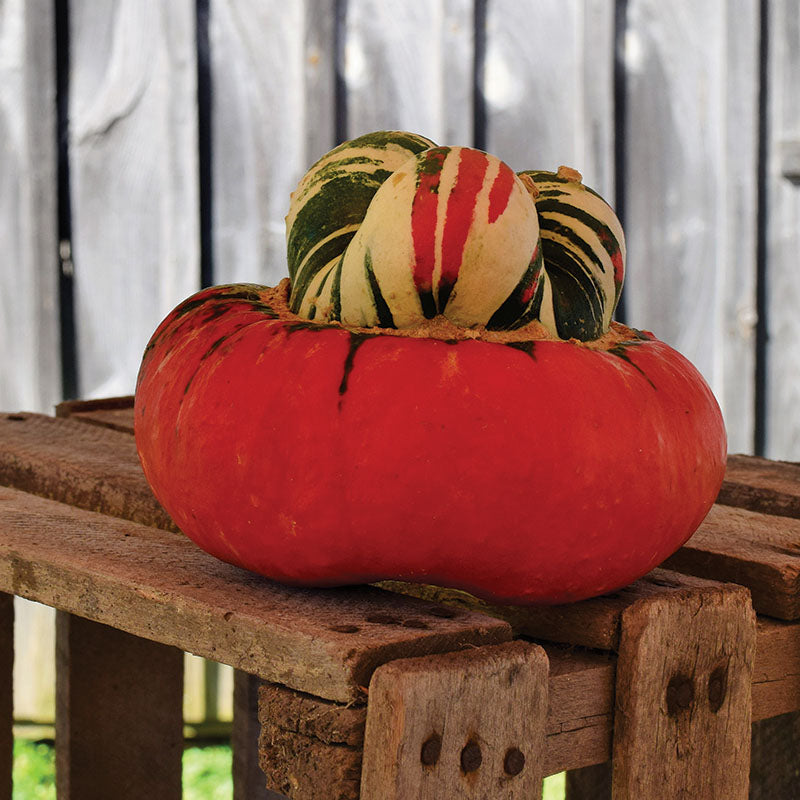 This excellent strain offers rich, deep colors and outstanding uniformity of size. The flattened 8 to 10" diameter fruit are brilliant orange-red with prominent "turbans" that display stripes and spots of scarlet, orange, cream, white, and green. The large vines yield heavily.