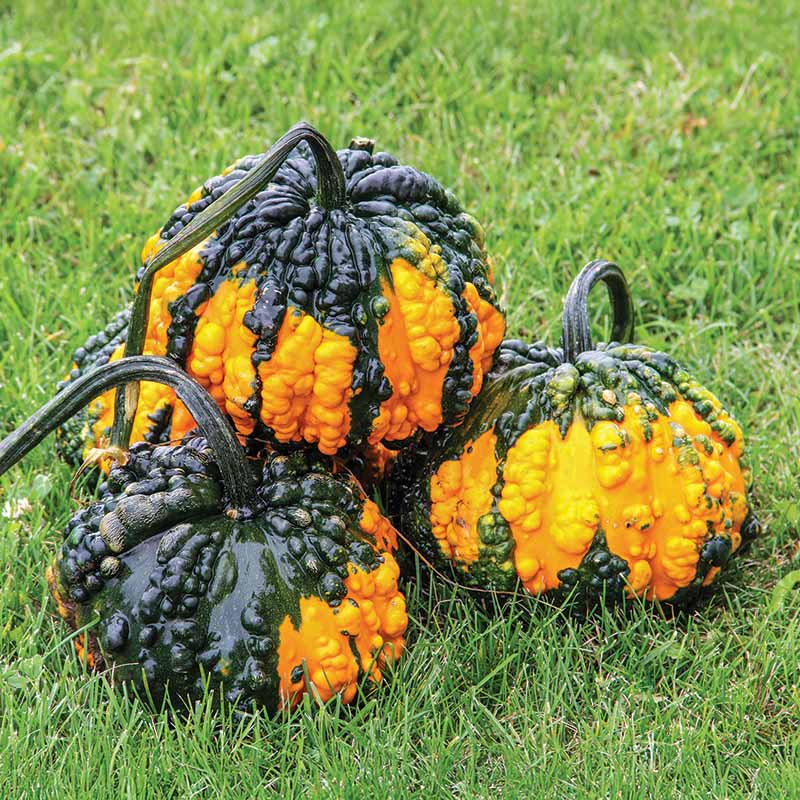 Intermediate bush plants produce distinctive warty fruit that add texture and deep color to fall displays. The hard-warted fruit are 7” wide x 5” tall, narrow stemmed, and mature from dark green and orange combinations to solid orange at full maturity (90 days).