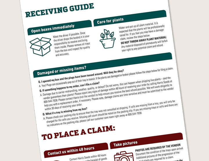 Contact Harris Seeds within 48 hours of receiving an order/receipt of goods from the carrier. Be prepared to provide your Harris
