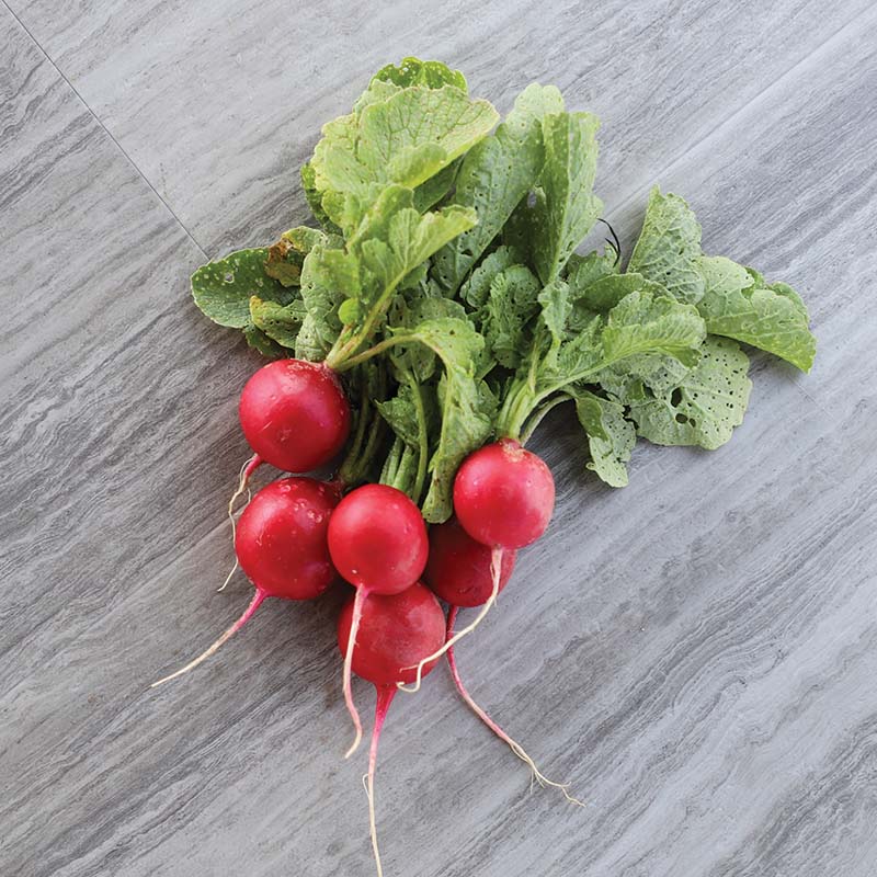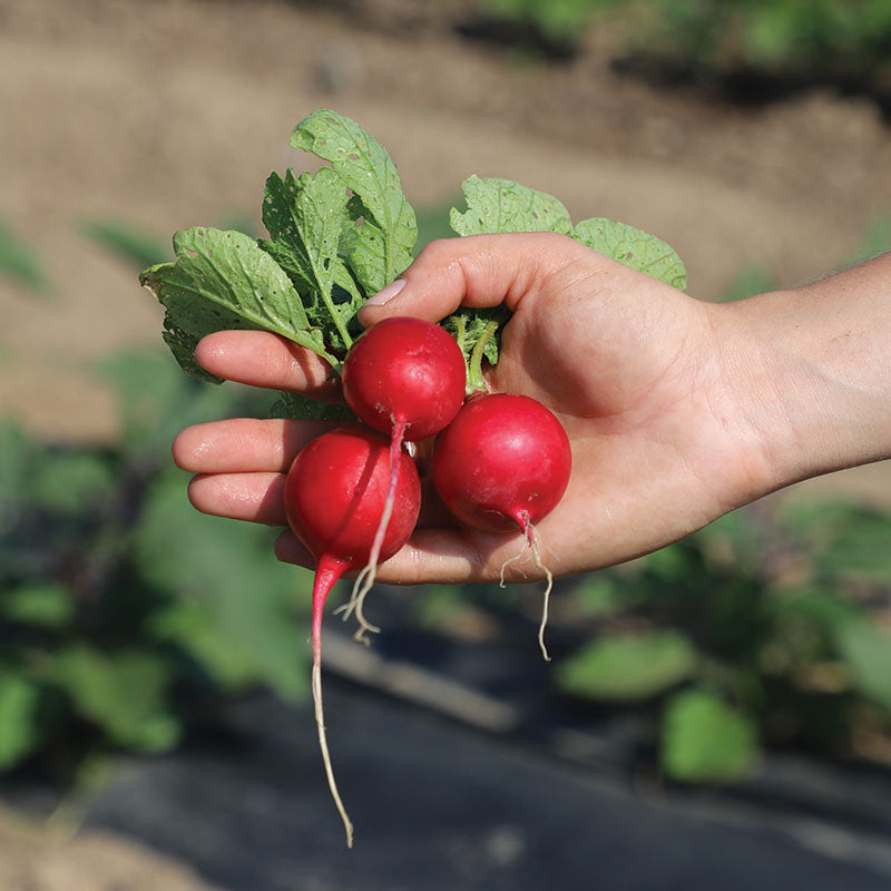 A natural for roadside sales. This vigorous variety is deep-round, bright red and slow to bolt. From the time they first reach edible size until they grow large, the roots stay mild, firm and delicious without a trace of pithiness. Grow extra-early and late plantings for tasty radishes all season