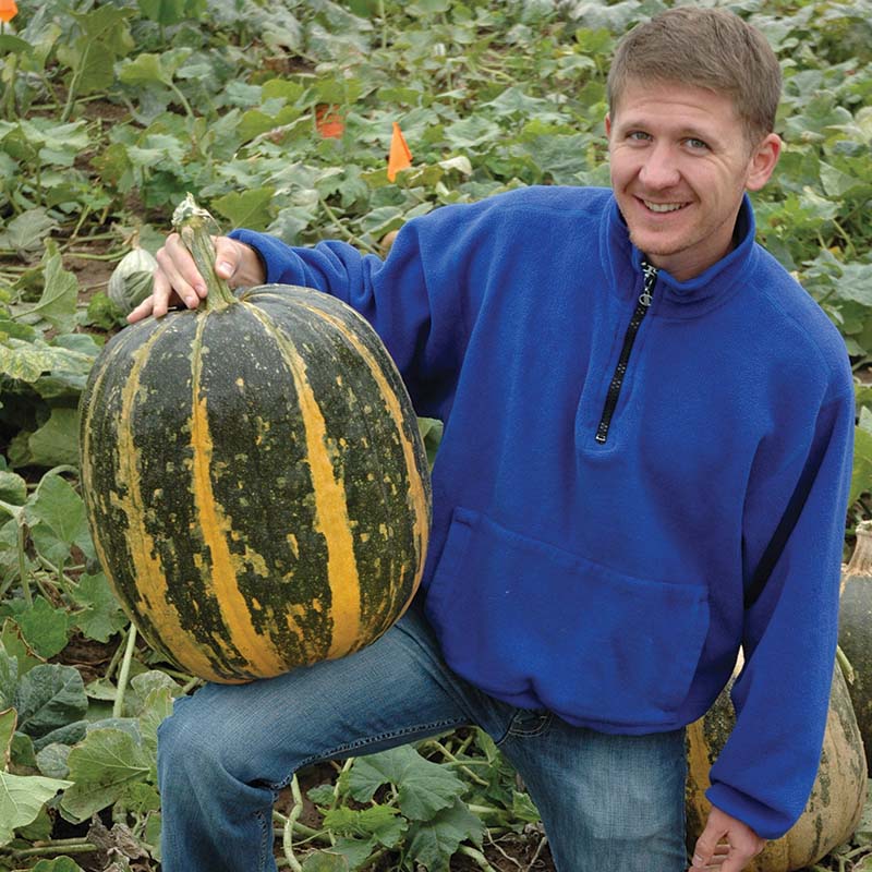 Tours novelty pumpkin, a unique French heirloom, looks much like a watermelon and add interest to your fall displays. Its tall upright shaped fruit are dark green in color and have light yellow-orange stripes that run from the top to the bottom. Tours' fruit have a diameter of 10 to 14", stand 12 to 18" tall, and have a contrasting light green stem that is hard and firmly attached.