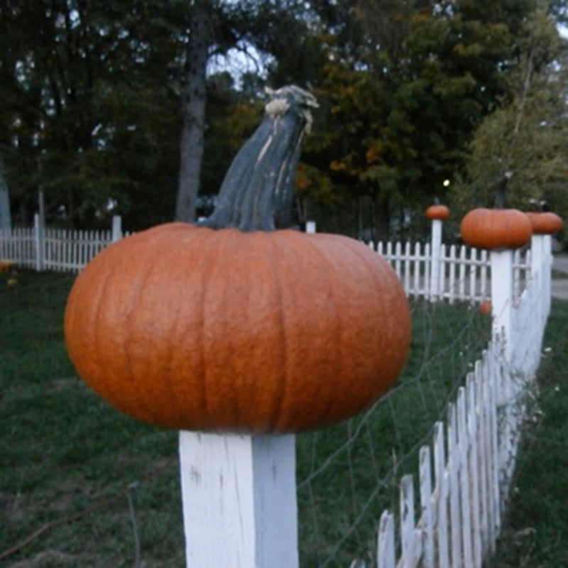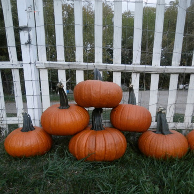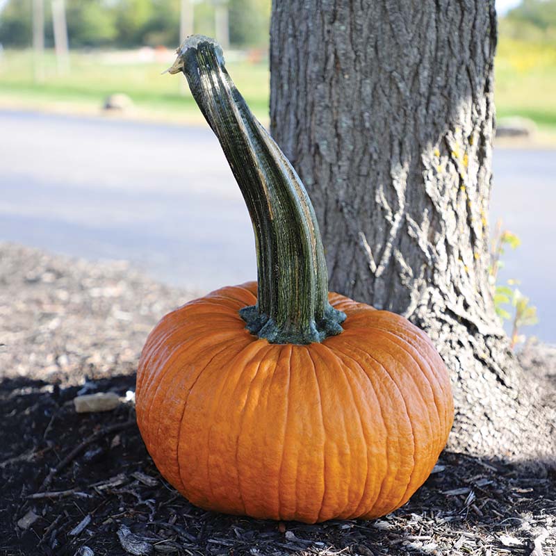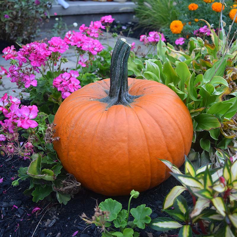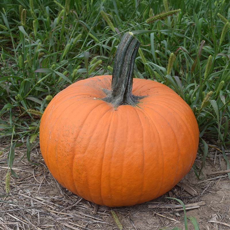 Thumpkin was bred by the breeder of Wolf pumpkin Chris Awald from North Collins, NY. Deep oblate shaped fruit with good ribbing are produced on vigorous full-size vines. The dark orange fruit have strongly rooted, thick, long stems that measure from 4 to 10" in length. The fruit are thick-walled and weigh between 15 to 25 lbs. Like Wolf, this variety needs room to grow. Recommended spacing is 6' between plants in the row and 12' between rows. If ground is fertile, then the recommended in row spacing should be moved out to 8' between plants. Plant this variety early and allow for good spacing or yields are severely affected.