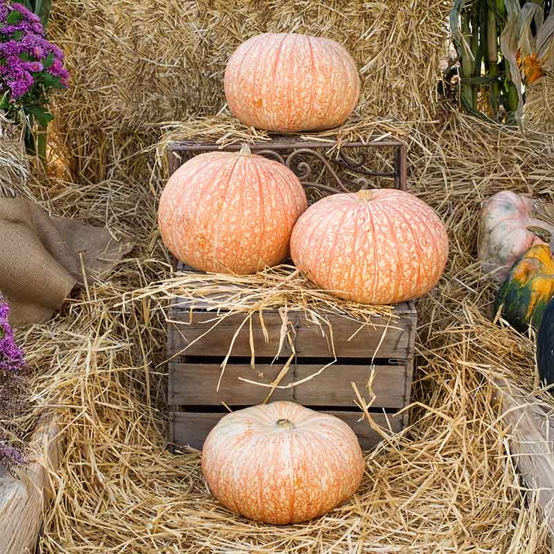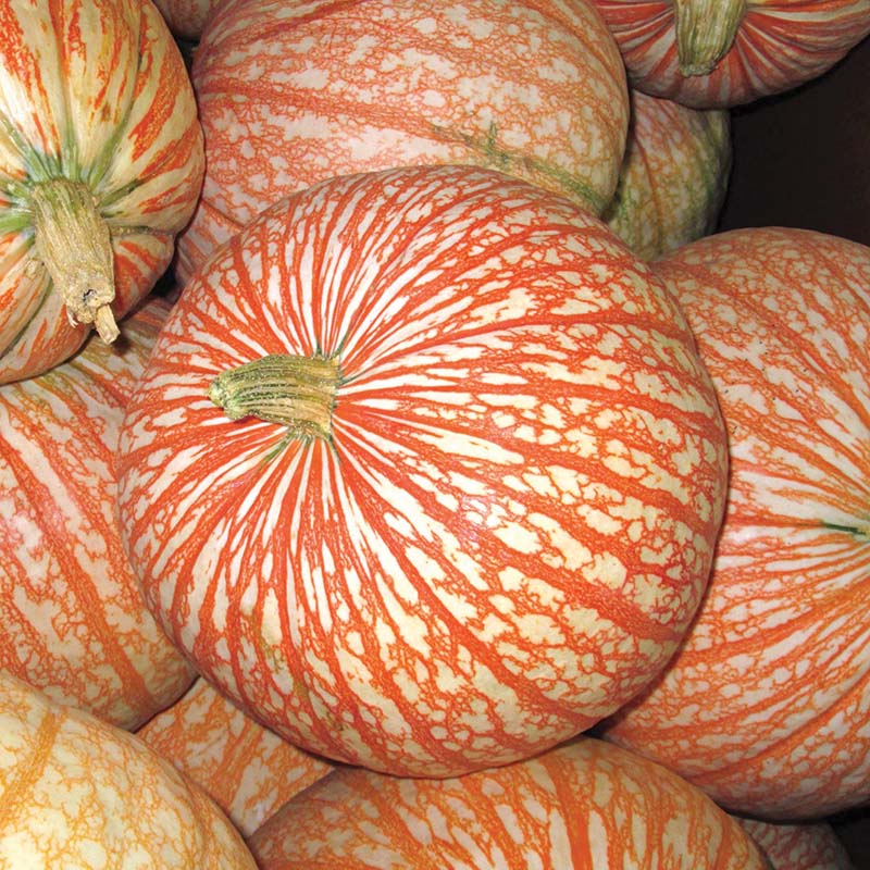 This is a truly distinctive ornamental pumpkin that has great decorative potential. Large vines produce white fruit that are laced with reddish colored veins. The pumpkins resemble a bloodshot eye and weigh 20 to 25 lbs. One Too Many can vary in shape from round to a flattened oblong shape. Intermediate resistance to powdery mildew.