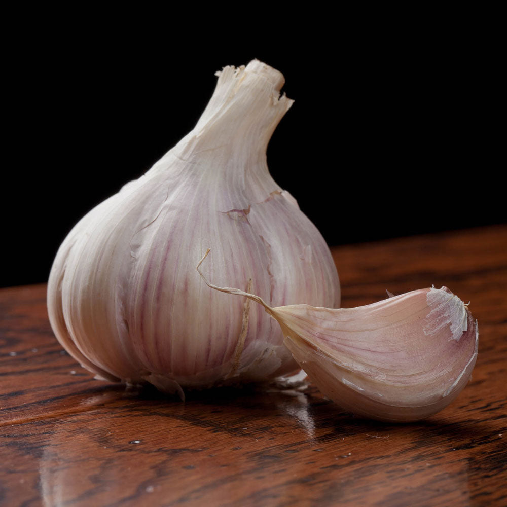 Music is a hardneck garlic, generally regarded as the most prized porcelain type. It produces very large bulbs; the white wrappers have some pink tint and purple striping. Approximately 4-7 cloves per bulb. It offers excellent flavor, pungent but not too hot. Scapes can be harvested and used for cooking before the garlic itself is actually harvested. Medium term storage. Performs well in any climate. Hardiness zones 3-8. Bulb size 1.5-2".