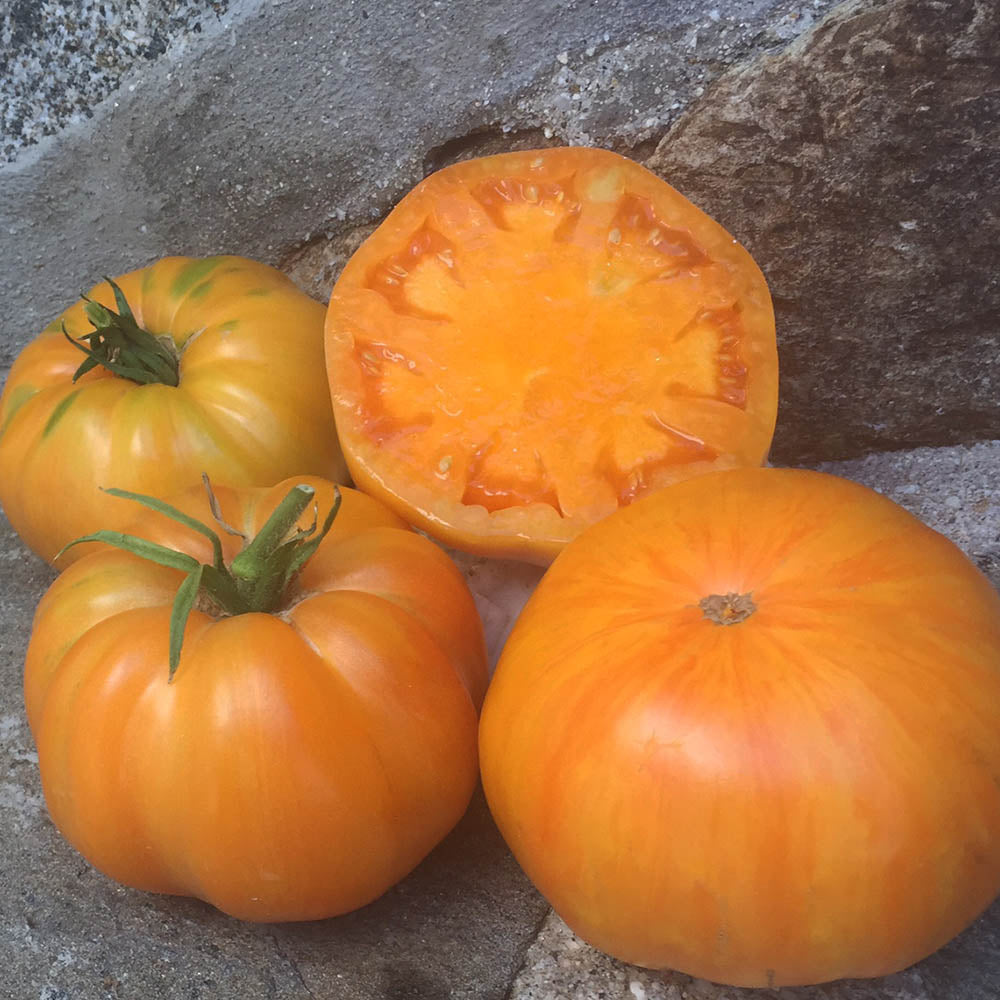 Unique orange beefsteak with yellow stripes. The large 1lb fruit has a prominent flavor with a hint peach. A great tomato for specialty farmers. This variety has been selected under disease pressure for the past 5 years, and forms very vigorous vines that are relatively resistant to fungal pathogens.
