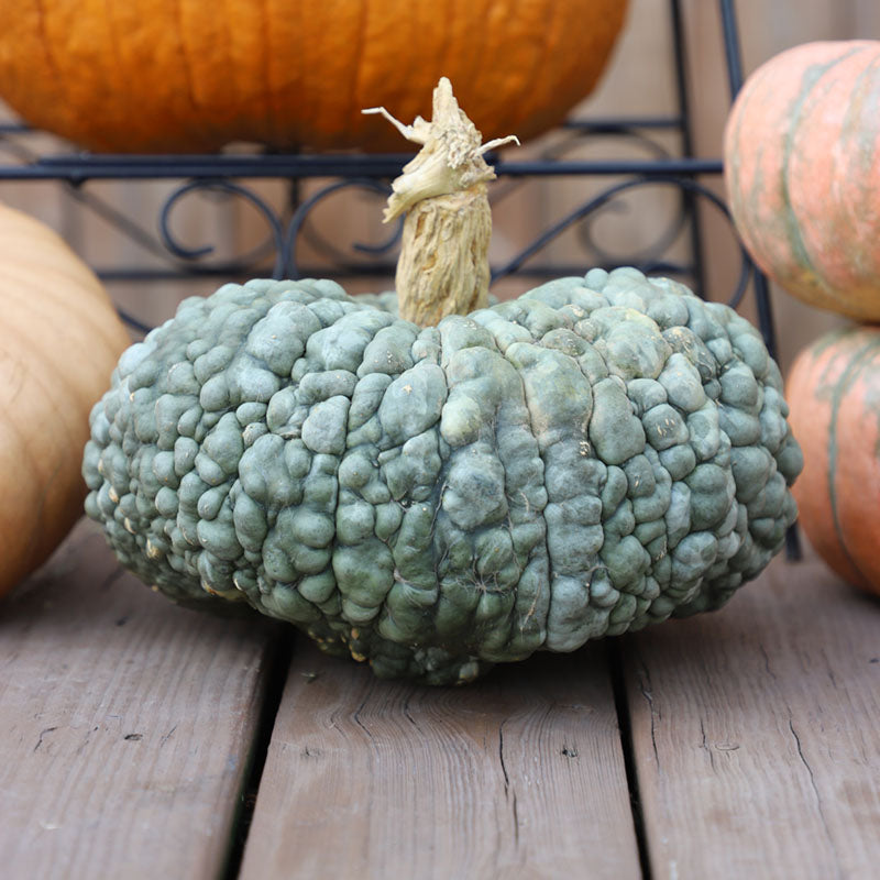 A unique green warted Italian heirloom squash valued for its eating quality, and traditionally used in preparing gnocci and ravioli. The perfect shape for stacking, this novel ornamental is also long-storing.