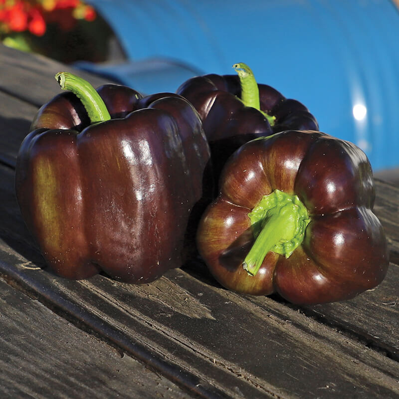 Blocky fruit have a beautiful deep purple color that holds well in the field for an extended period before ripening to red. The elongated 3" fruit are thick walled, sweet and flavorful with green internal color. Productive in a range of conditions with high resistance to TMV and ToMV (races 0-2).