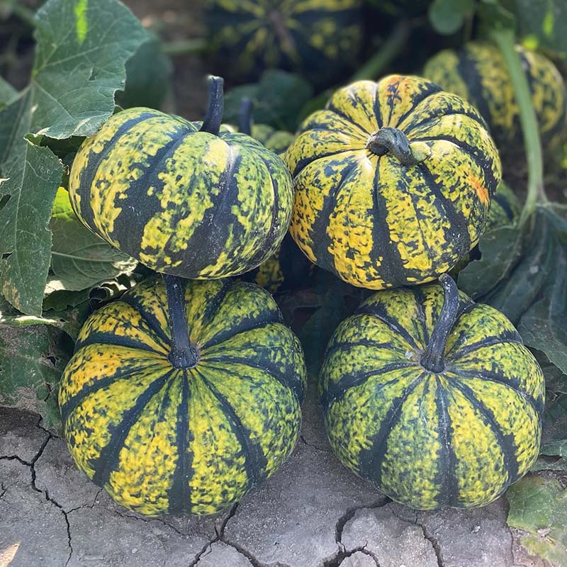 A tri-color mini pumpkin to complement Casperita and Orangita, Phantomita is dark green with light green and yellow striping for a unique pixelated look. The disk-shaped fruit has deep ribbing, weighs 1-1.5 lbs., and is edible with acorn squash quality. Phantomita's semi-bush plant is a strong producer and carries intermediate resistance to Powdery Mildew and Watermelon Mosaic Virus.