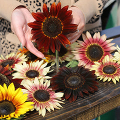 Dark centers are ringed by a wide range of vibrant outside colors, reminiscent of a setting sun. Stems are branched, producing multiple heads that exhibit a long bloom period, a great attribute for cuts. The 6 - 8 ft. tall plants make a stunning show when planted as a screen or back drop in your garden or field.