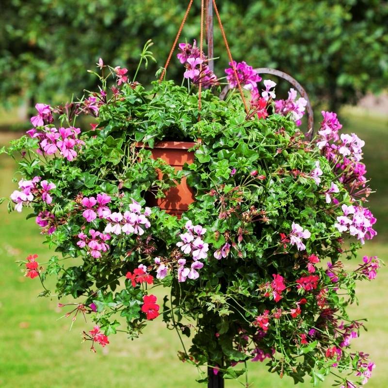 No more tangled plants! The compact habit and short internodes make this new Ivy Geranium easy to grow. For landscapes, containers and baskets, Reach Out provides a canopy of color. Ivy geraniums have waxy leaves and flower heads that are not as large or globular as common geraniums, but still cover plants nicely. Their trailing habit makes them particularly suitable for containers, window boxes, and hanging baskets.