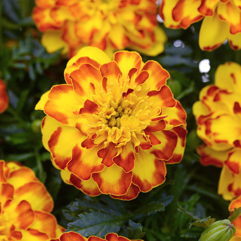 The flowers of this variety feature an unconventional reverse color pattern compared to the standard ‘bee’ type crested marigolds. The final effect when planted outdoors is quite striking!