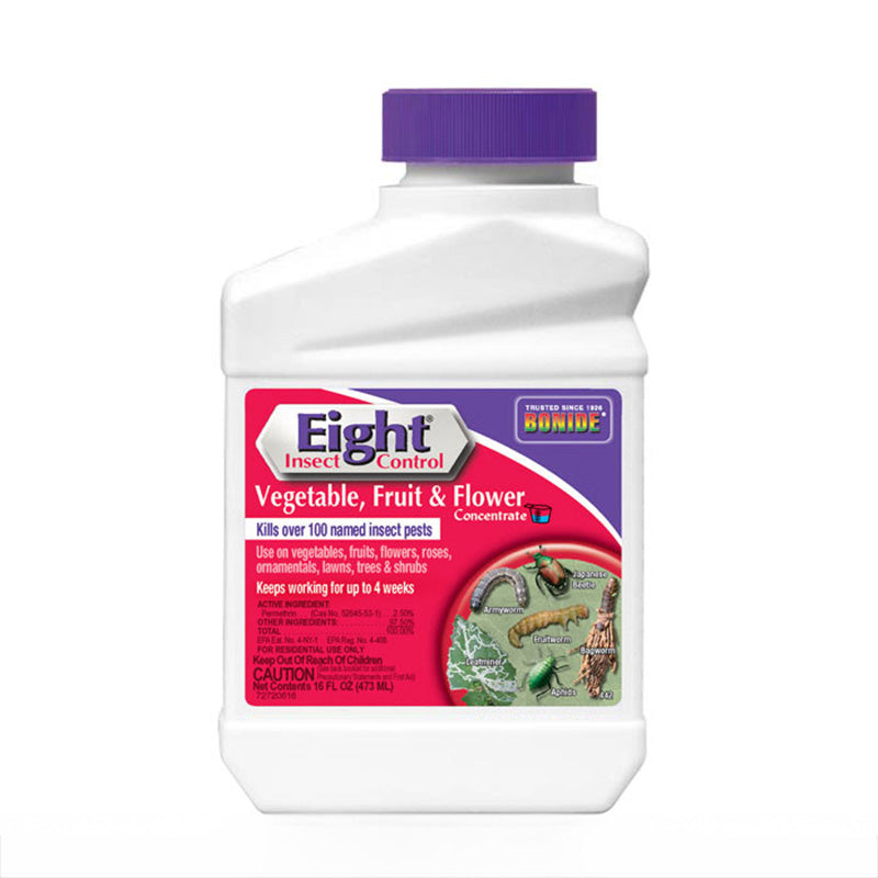 Controls insects up to 4 weeks! Eight Insect Spray is a contact and residual insect control spray that is effective for up to 4 weeks. Kills over 100 insects which destroy lawns, roses, flowers, trees, shrubs, vegetables, fruit, and nuts. Apply to lawns and other areas to stop infestations of flies, ticks, fleas, mosquitoes, ants - all flying, crawling and hopping insects. It's even great for houseplants! Mix 1-3 oz. per gallon.