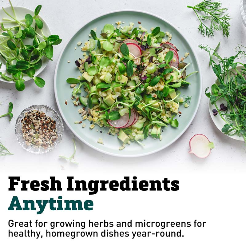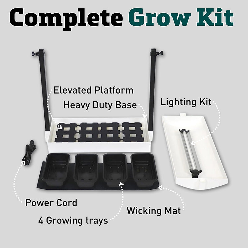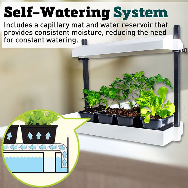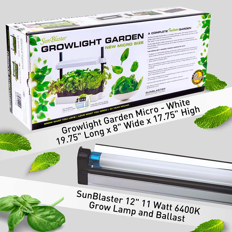 The Micro Grow Light Gardens full spectrum (6400K) grow lights replicate natural sunlight for year round growing. It is perfect for growing salads and herbs or for starting transplants. It features a high efficiency SunBlaster 11 Watt high output light consuming 20% less power than a standard domestic light bulb and provides 10,000 hours of use. The NanoTech Reflector reduces heat build-up and maximizes performance by reflecting 100% of the light towards the plants. The garden comes with 4 reusable tough growing trays for easy succession planting and includes a raised platform insert with a capillary mat that allows plants to self-water for up to 14 days (subject to climate conditions). It measures 19.75" Long x 8" Wide x 17.75" High.