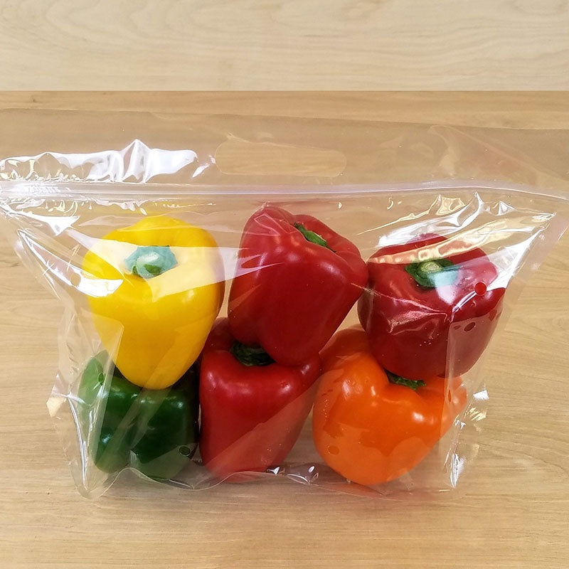In today’s fast pace lifestyle these Grab n Go bags are the ultimate in convenience for customers at your farm market or farm stand. Great for all types of vegetables and fruit, as well as meal combos. The gusseted bottoms allow for them to stand for easy display and also feature a reinforced handle, holes for ventilation, a re-sealable zipper, and a center area for labeling, pricing or recipes. Bag Measurements of Extra Large size: 14.4”W x 11" H, holds approx. 6pk of pepper or tomatoes.
