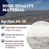 This medium weight grade Agribon AG-30 83" x 50' row cover is excellent for frost, wind, season extension, insect and animal protection. The 0.9 oz./sq.yd. cover allows 70% light transmission and provides 4-6°F of frost protection. The row cover can be used as a floating cover with or without support hoops. Polypropylene fabric is spun-bonded with UV stabilizers and comes folded in half, then rolled for ease of handling and shipping.