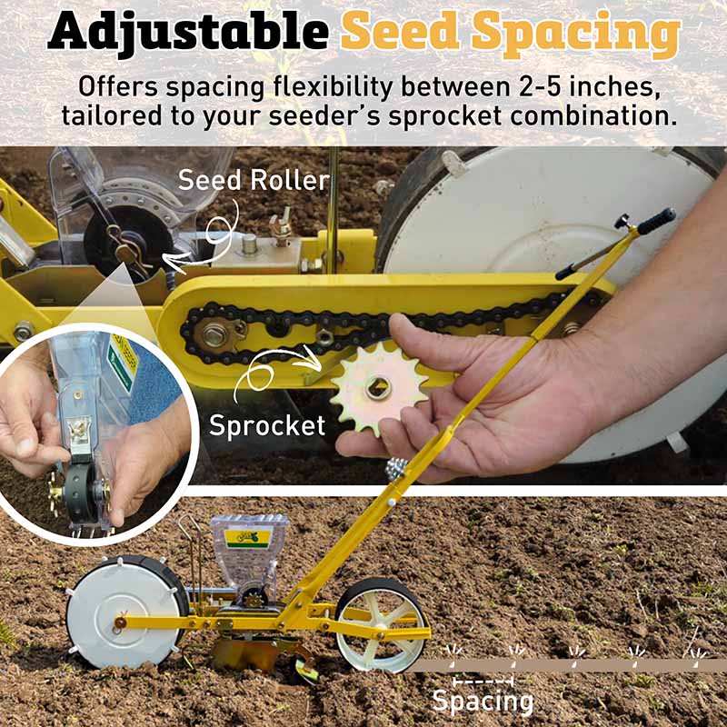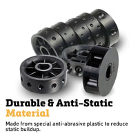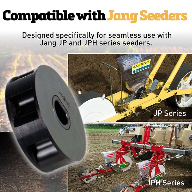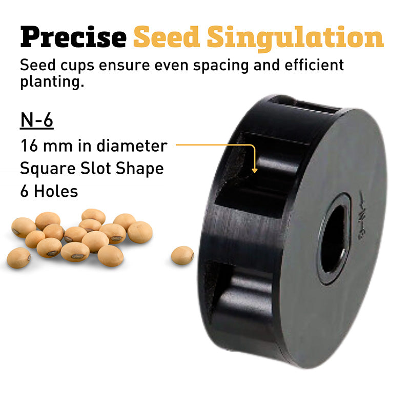 The N-6 seed roller has 6 larger scoop sized holes for a more dense planting of larger seeds like beans and corn. Spacing is adjustable from 4-10” apart depending on seeder sprocket combination. Due to the larger scoop shape of the cup it may plant more than one seed at a time.. Made from anti-abrasion plastic to prevent build-up of static electricity that causes seeds to stick together.