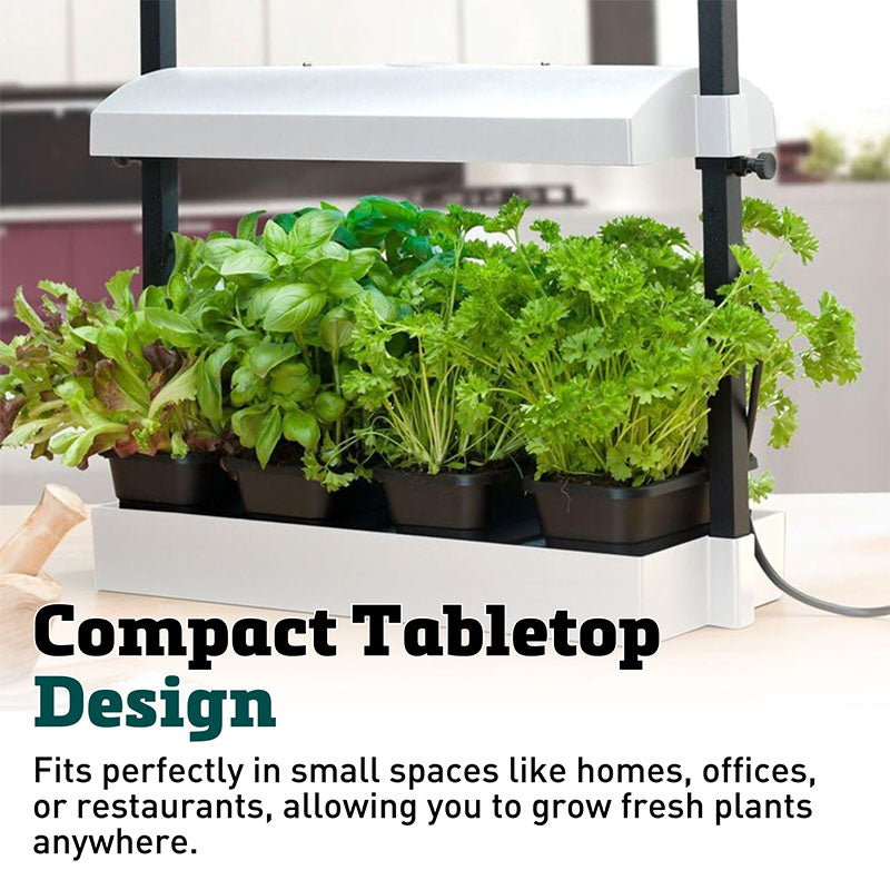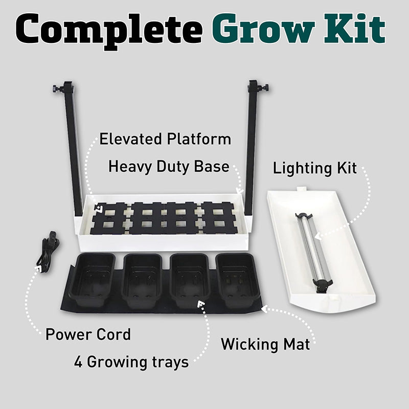 The energy efficient, full spectrum 6400K grow lights replicate natural sunlight for year round growing. Perfect for growing salads and herbs or for starting transplants. The dome reflector maximizes performance by reflecting 100% of the light towards the plants. Includes 4 reusable growing trays and raised platform insert with capillary mat. Stand measures 19 3⁄4”W x 17 3⁄4”H x 8”D.