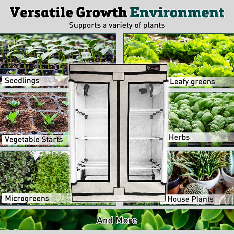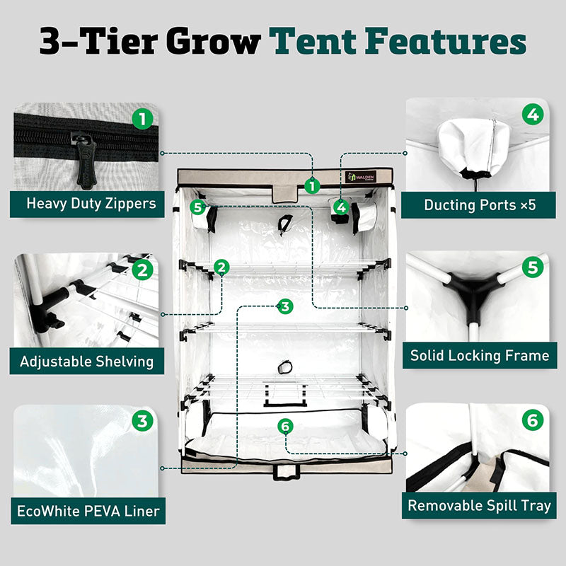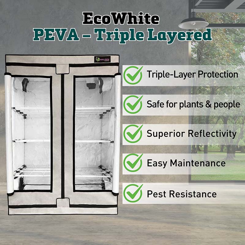All Walden Grow Tents are manufactured using industrial-strength zippers and 100% EcoWhite PEVA material. The toxin-free material creates a safe, stylish and easy to clean growing area that keeps insects and other pests out. The triple-layer design is composed of a 600D canvas exterior, a vinyl light-blocking center and a white vinyl interior that is 10% more reflective than even the most reflective mylar tents.