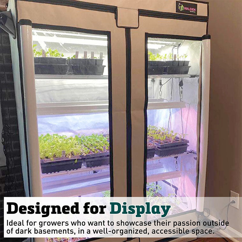 Double-wide front doors allow growers easy access to plants or to put them on full display. Extra-large front viewing windows (18.5"x50") let growers check on plants without disturbing humidity or temperature. Window covers roll back and secure with velcro straps.