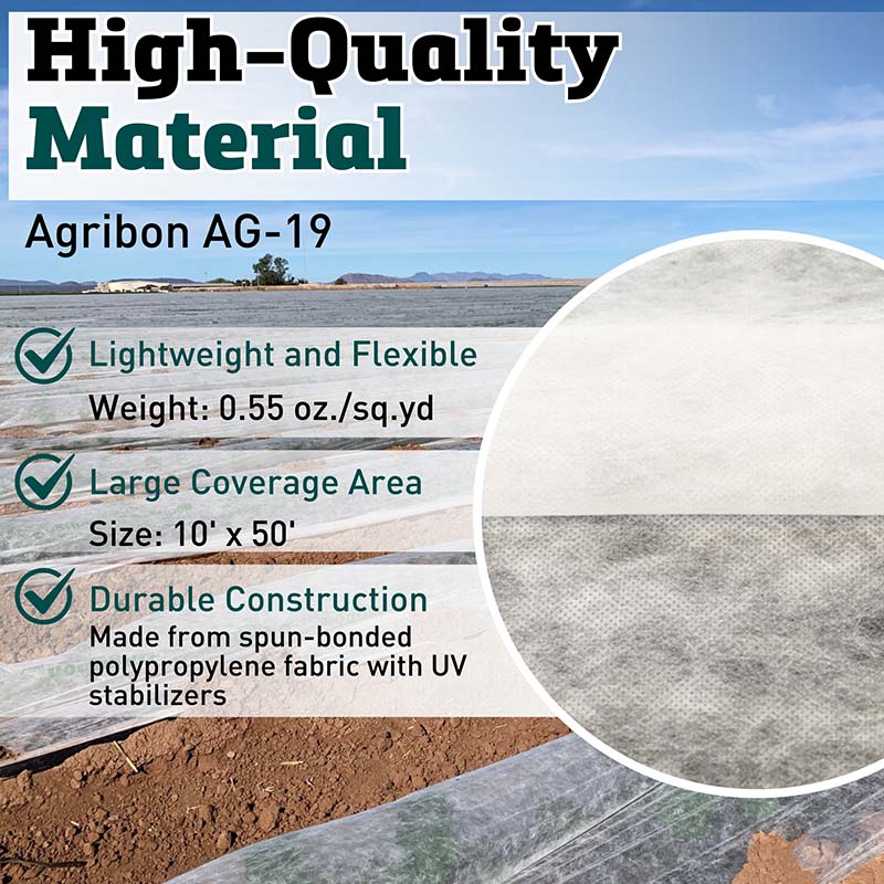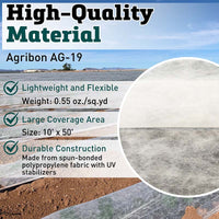 This multi-purpose Agribon AG-19 10' x 50' row cover is a lightweight grade cover that is excellent for light frost, season extension, insect and animal protection. The 0.55 oz./sq.yd. cover allows 85% light transmission and provides 3-4°F of frost protection. The light weight material can be used as a floating cover with or without support hoops. Polypropylene fabric is spun-bonded with UV stabilizers and comes folded in half, then rolled for ease of handling and shipping.