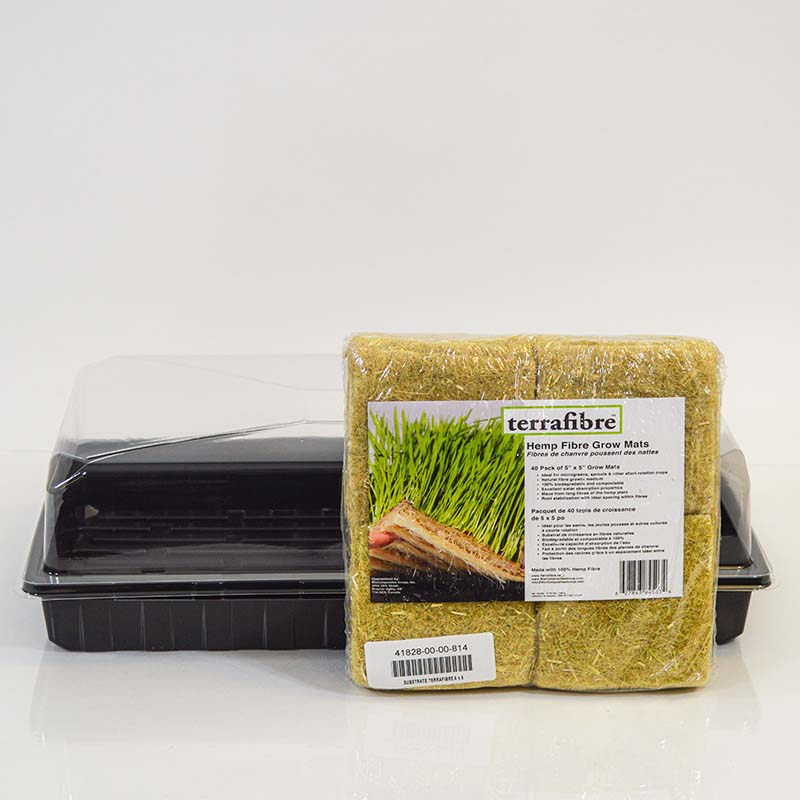 Introducing our Terrafibre Microgreens Starter Kit - the perfect way to elevate your culinary experience and embrace a healthier lifestyle. Grow your own nutrient-packed microgreens effortlessly with this comprehensive kit. The package includes a sturdy tray, a clear plastic dome for optimal germination, and 40 - 5"square hemp mats that provide the ideal substrate for your tiny greens.