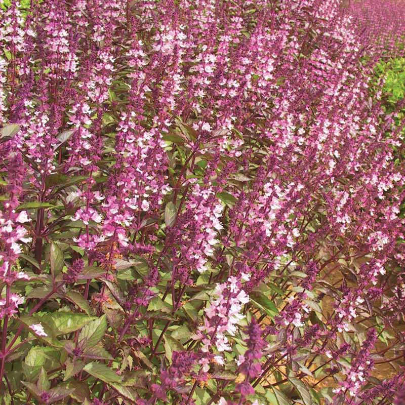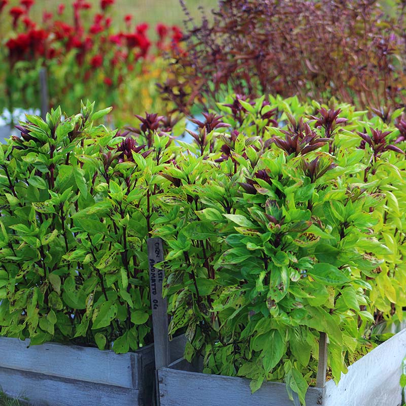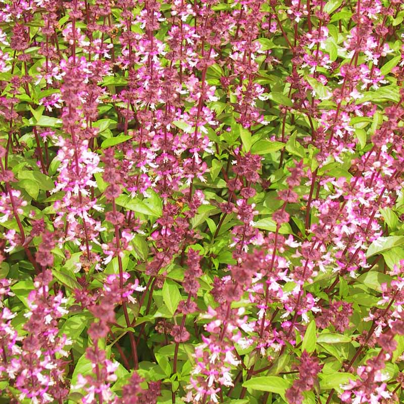 A favorite for foliage and blooms, the leaves are dappled in purple to green with purple blooms. Height: 24-30”, 12-14” spread.