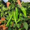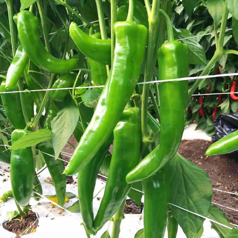 Anaheim. Vigorous, adaptable plants set high yields of smooth, flat, 7” long Anaheim peppers. The fruit are high quality with a medium green color and a tapered two-lobed shape.